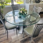 - Glass-topped metal dining table